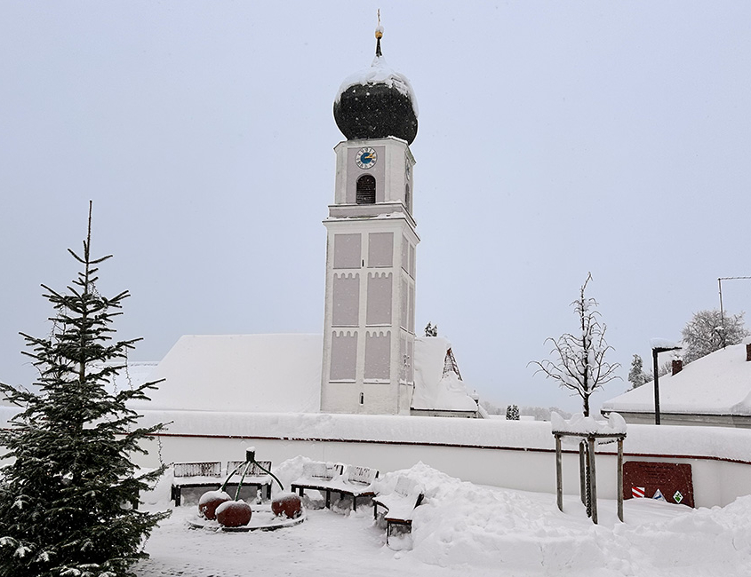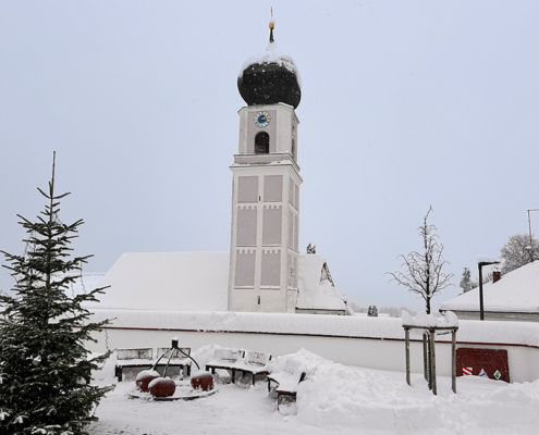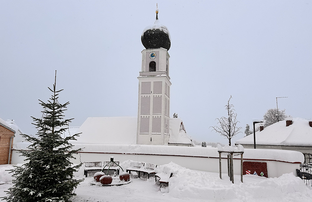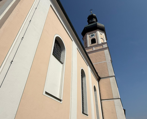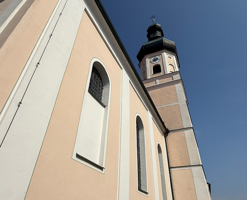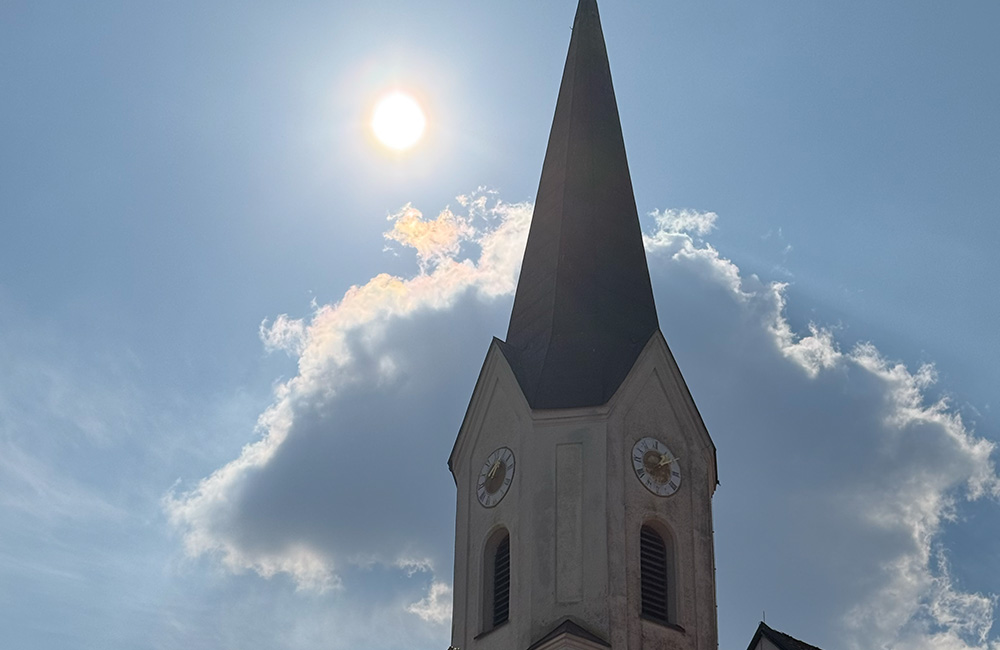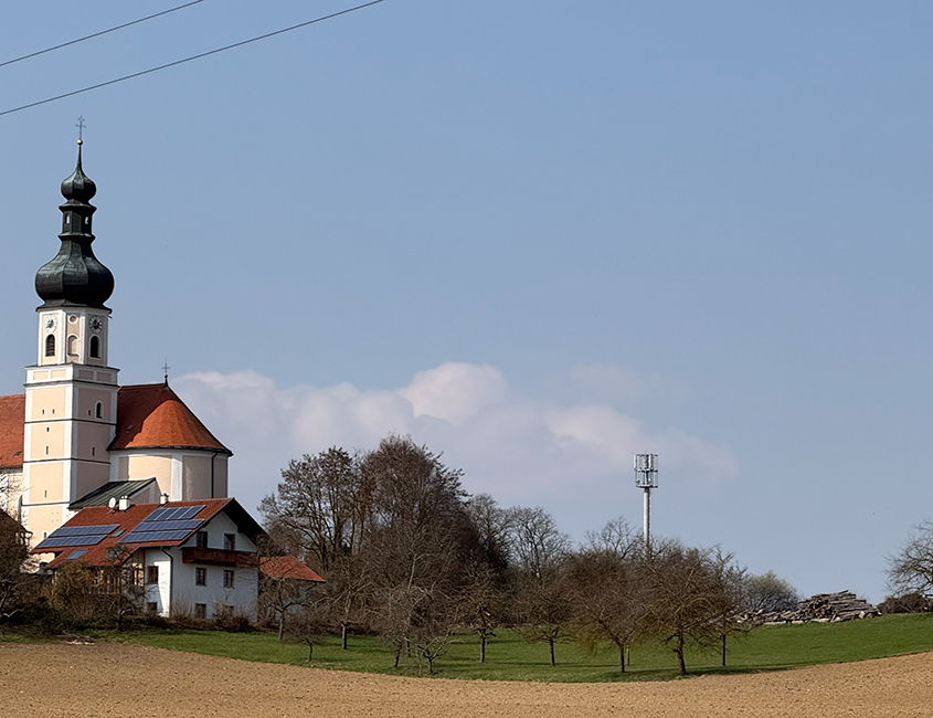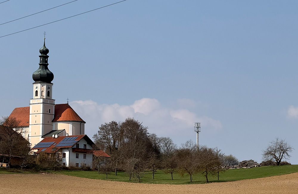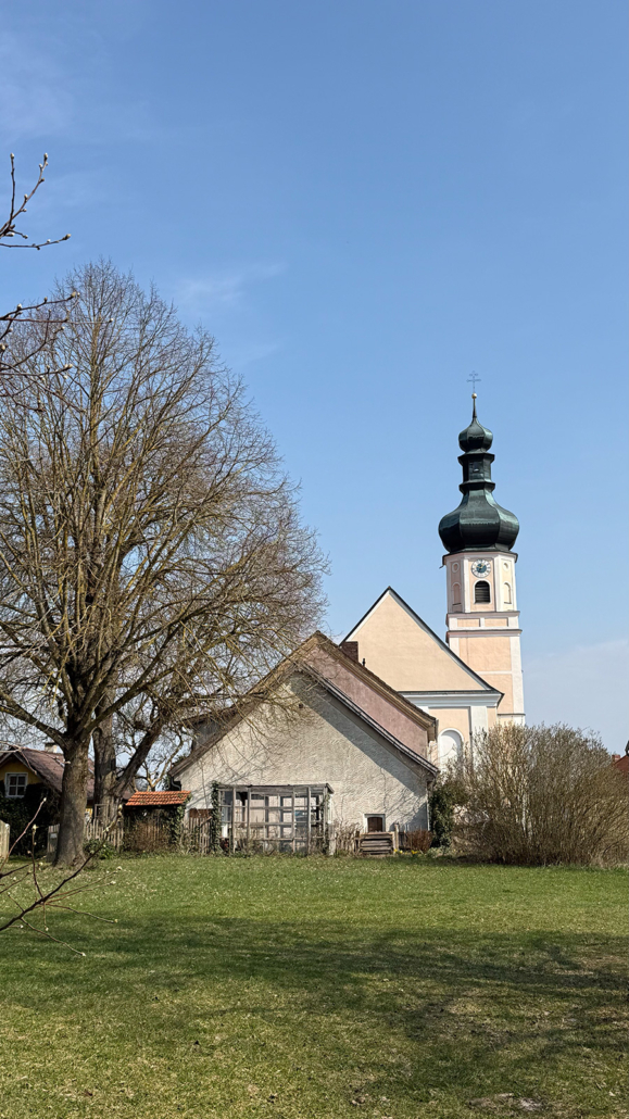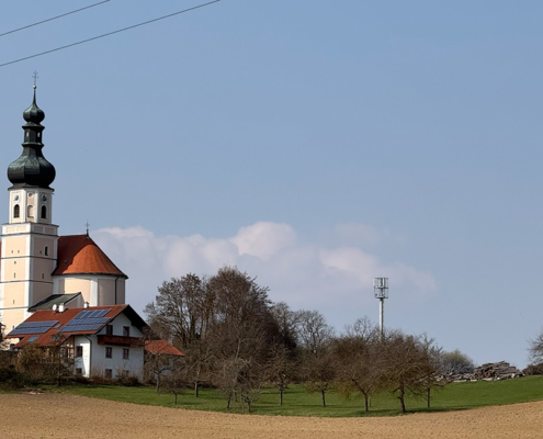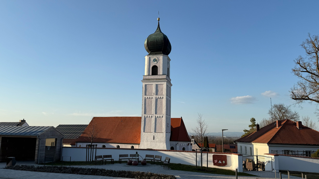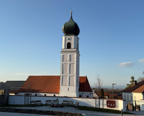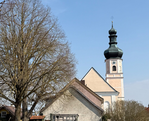 - Die Pfarrkirche St. Laurentius als optisch charakteristisches Wahrzeichen, vom Isartal aus als höchster Punkt gut zu erkennen.