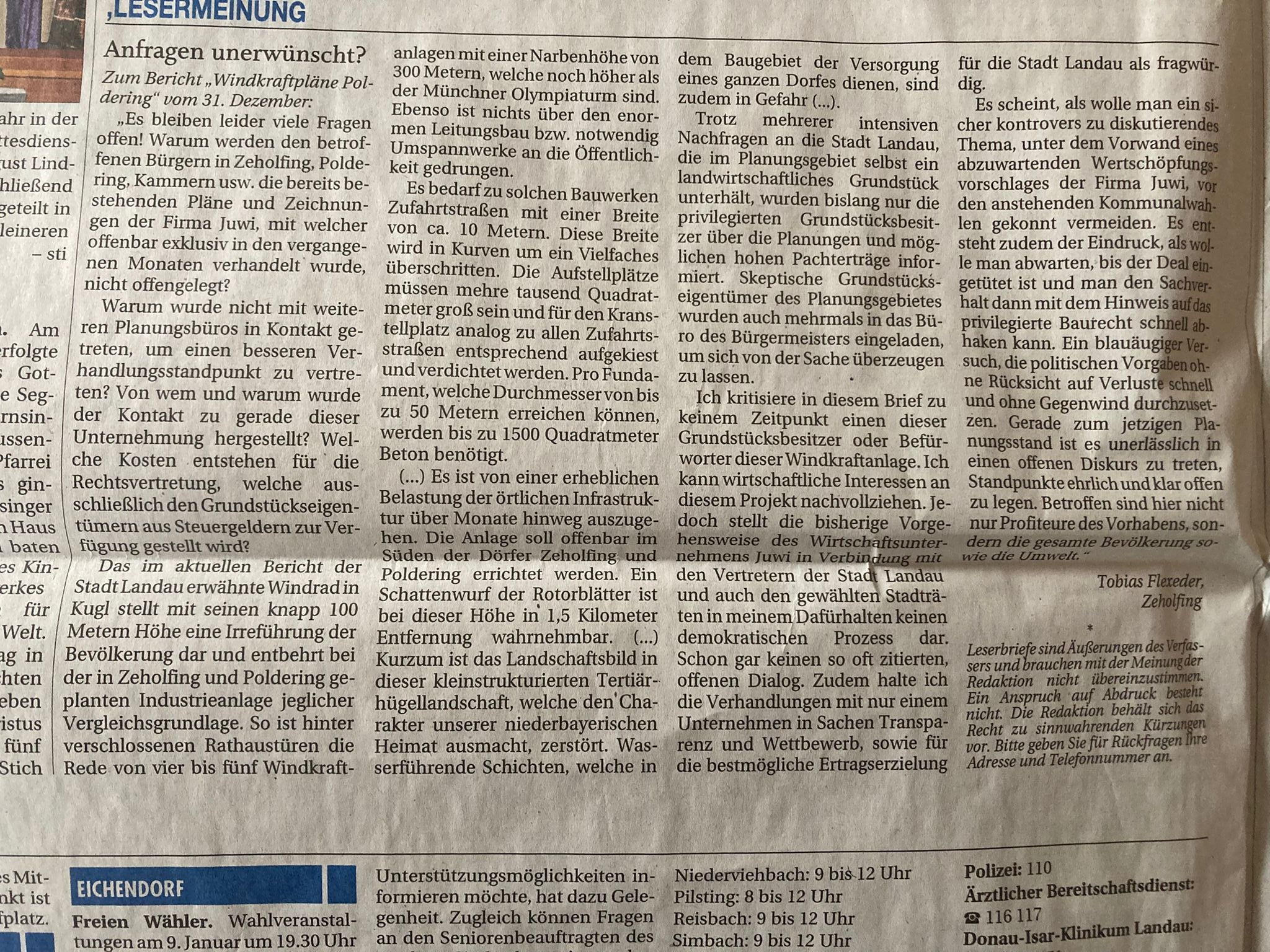 Leserbrief Tobias Flexeder zum Vorgehen rund um das Windvorranggebiet DGF-28